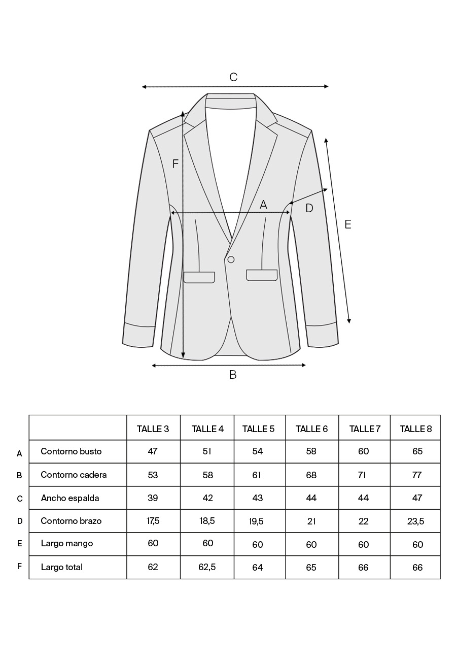 Jose mide 1.78 y sus medidas son 90 – 72 – 99 ella usa un talle 3, para esta foto usamos el talle 4 para darle un look descontracturado usando el blazer mas suelto