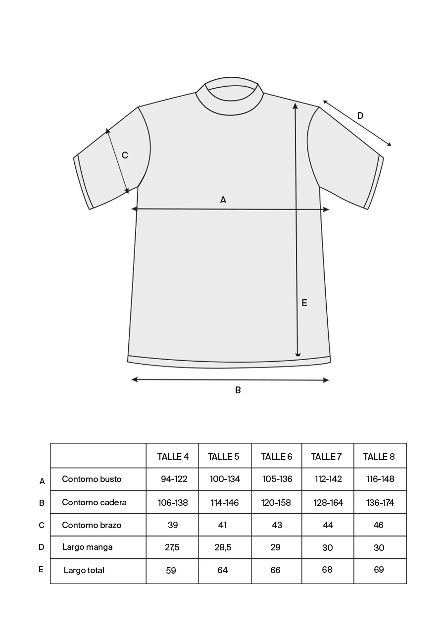 Para que tengas en cuenta el largo de la remera varia en los talles más grandes. Por eso fíjate en la tabla de medidas, porque los talles 2 3 y 4 son más cortos y los talles 5 6 7 8 son largas.